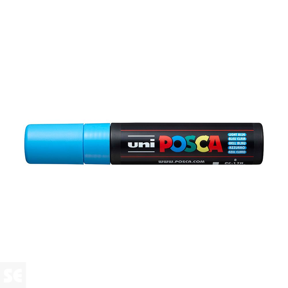 Rotulador Pintura Posca Azul Claro Pc17k 15 mm. Cuerpo de plástico (PP). Marcador de pintura con tinta pigmentada base al agua. Pinta sobre cualquier superficie y es muy resistente a la luz. Es inodoro. Las manchas se pueden lavar con agua, desapareciendo inmediatamente. Ideal para cartelería, decoración, escaparatismo, posters, etc. Permanente sobre superficies porosas. NO ES TÓXICO.